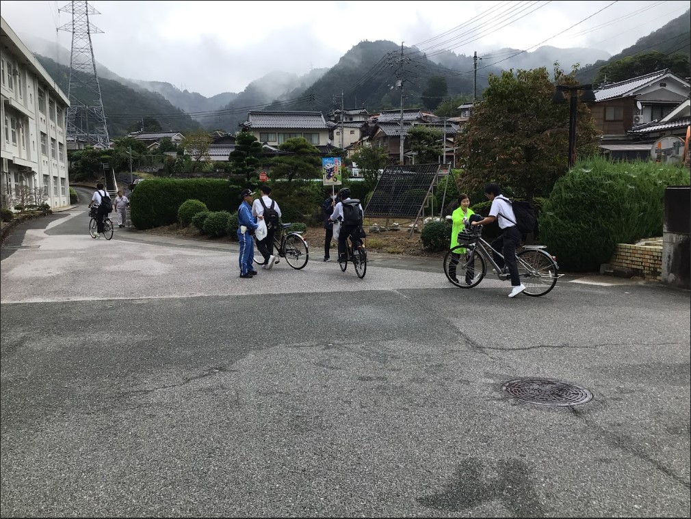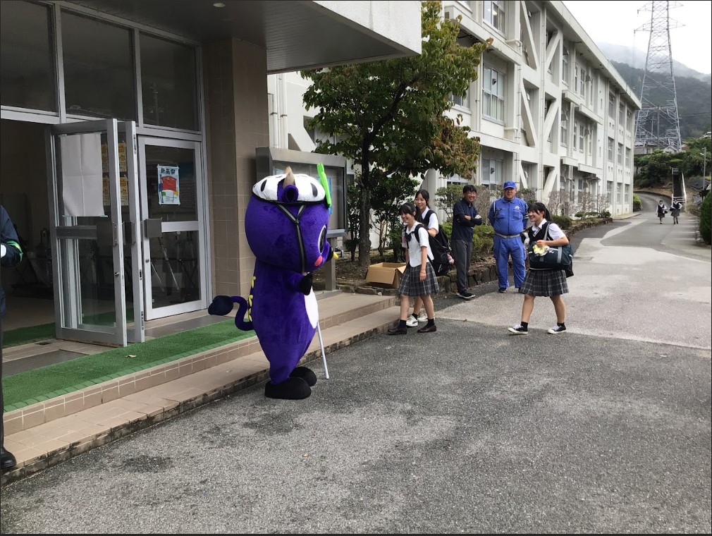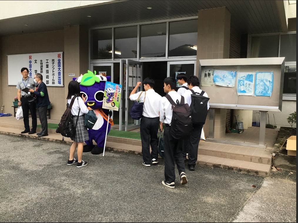 玄関前には新見市のマスコットキャラクター「にーみん」もヘルメットを着けた状態で登場し、生徒達は笑顔で手を振っていました。