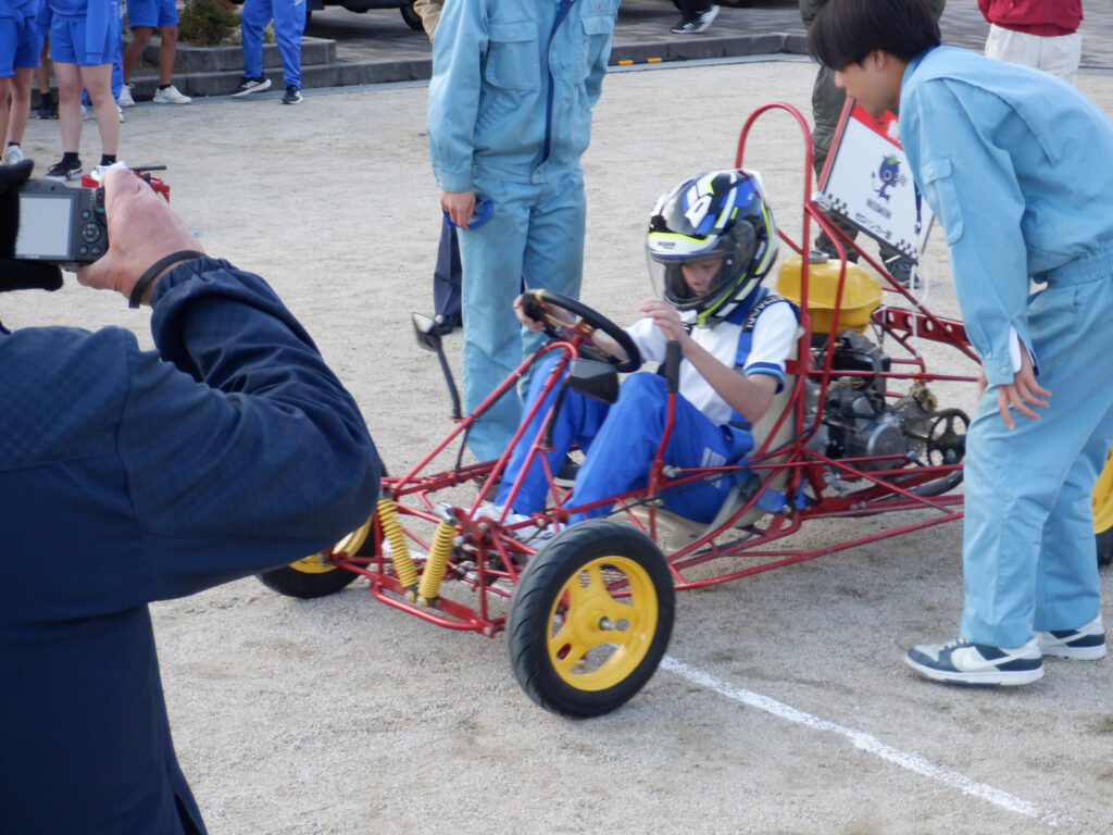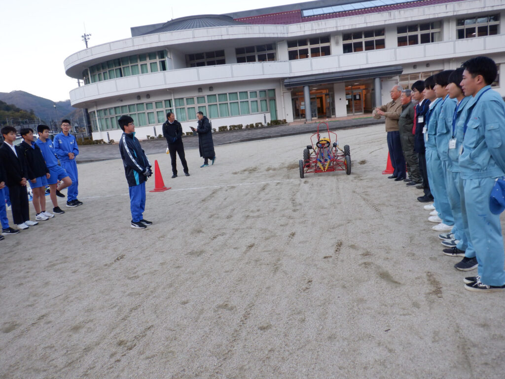 11月18日(水)、新見車検工場会の指導者3名のご協力のもと、工業技術科3年生6名は出前授業のために新見南中学校を訪れました。最初に、ゼロハンカーの取り組みについてのDVD視聴の後、グランドに移動し、体験授業を行いました。この度のゼロハンカー体験授業で高校生指導者は2度目の出前授業であり、前回よりなれた様子で、中学2年生20名に乗車方法や走行時の注意点を丁寧に説明しました。中学生の感想は「最初怖かったけれど、運転がとても楽しかった」と好評で、授業は成功を収めました。高校生たちは、この出前授業を通じて達成感を感じ、楽しんでいる様子でした。今回の授業がきっかけとなり、中学生たちに新見高校工業技術科に興味を持っていただき、進路選択の一つとして考えていただけることを願っています。