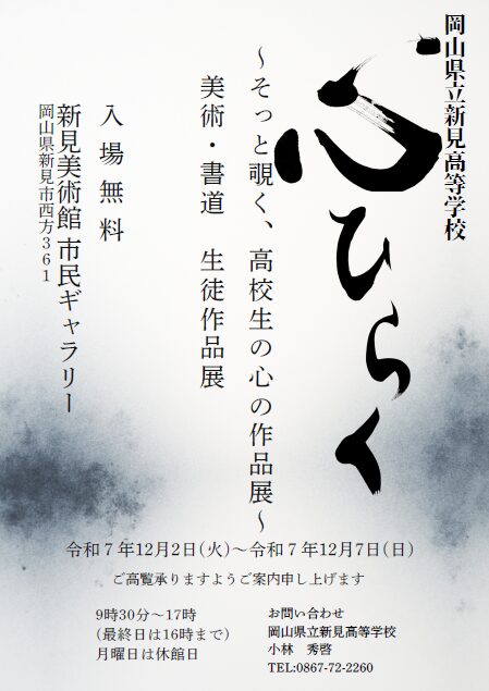 | 心ひらく~そっと覗く、高校生の心の作品展~(美術・書道生徒作品)のご案内 とき:12月2日(火)~12月7日(日) ところ:新見美術館 市民ギャラリー 本展は、高校生が日頃の学習や部活動を通して制作した美術と書道の作品を一堂に集めたものです。 彼らが抱える瑞々しい感性が、鮮やかな色彩や力強い筆致で表現されています。 エネルギー溢れる力作の数々をぜひご高覧ください。 皆様のご来場を心よりお待ちしております。 |