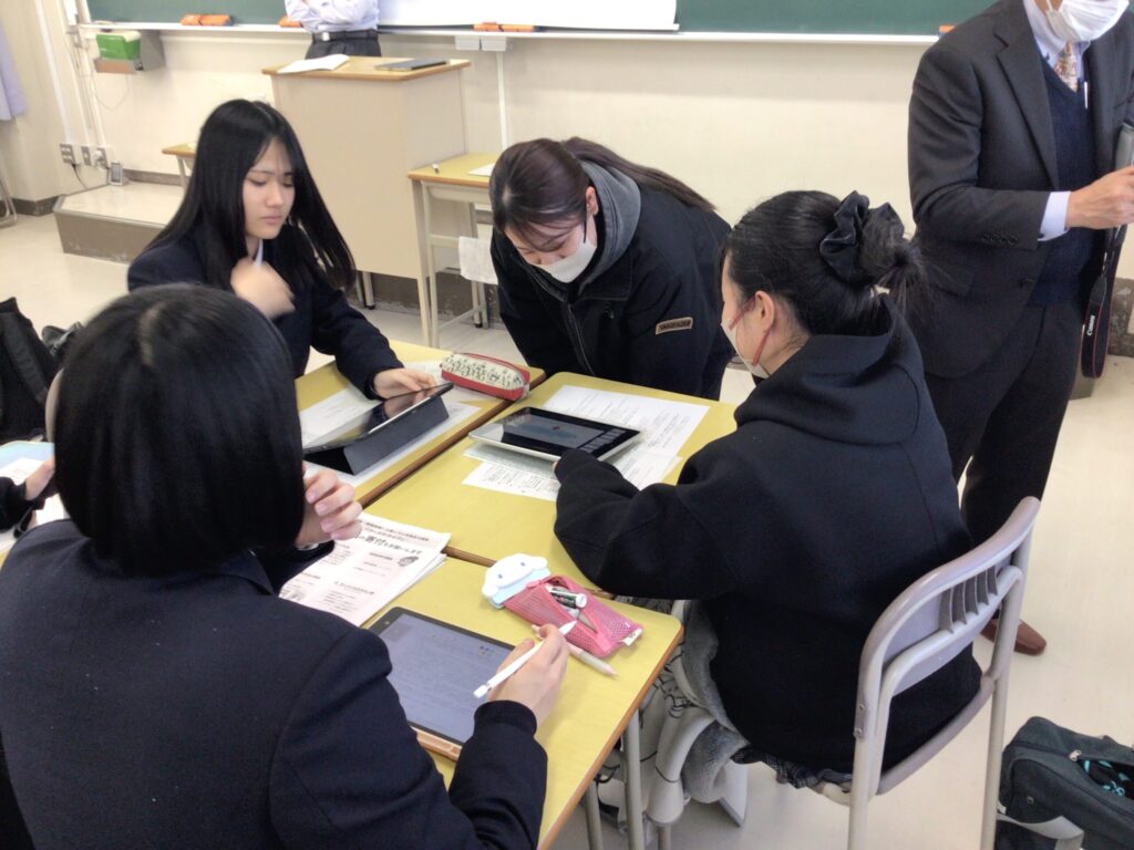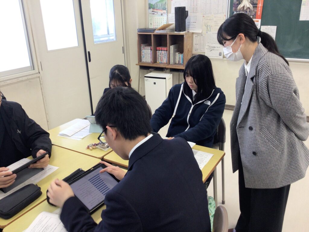 そんな中、1月14日(水)に新見公立大学生が発表内容や資料作成のアドバイスをしに来校してくださいました。来校してくれた新見公立大学生の皆さんは、本校の卒業生であり、自分たちの高校の時の経験や大学で広げた知見をもとに、多くのアドバイスを本校生徒にしてくださいました。