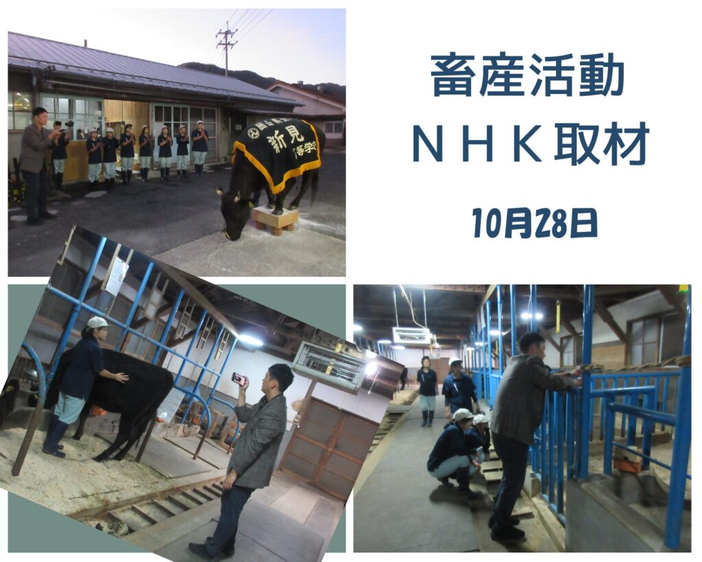 先日取材のあった、NHK岡山放送局「もぎたて!」による新見高校生物生産科「畜産班」の様子が、10月30日に放送されました。生徒たちが日頃から行っている牛の世話や、畜産への真剣な取り組みが紹介されました。生徒たちにとっても、大変貴重な経験となりました。取材してくださった齋藤アナウンサー、並びに「もぎたて!」の皆様、本当にありがとうございました!